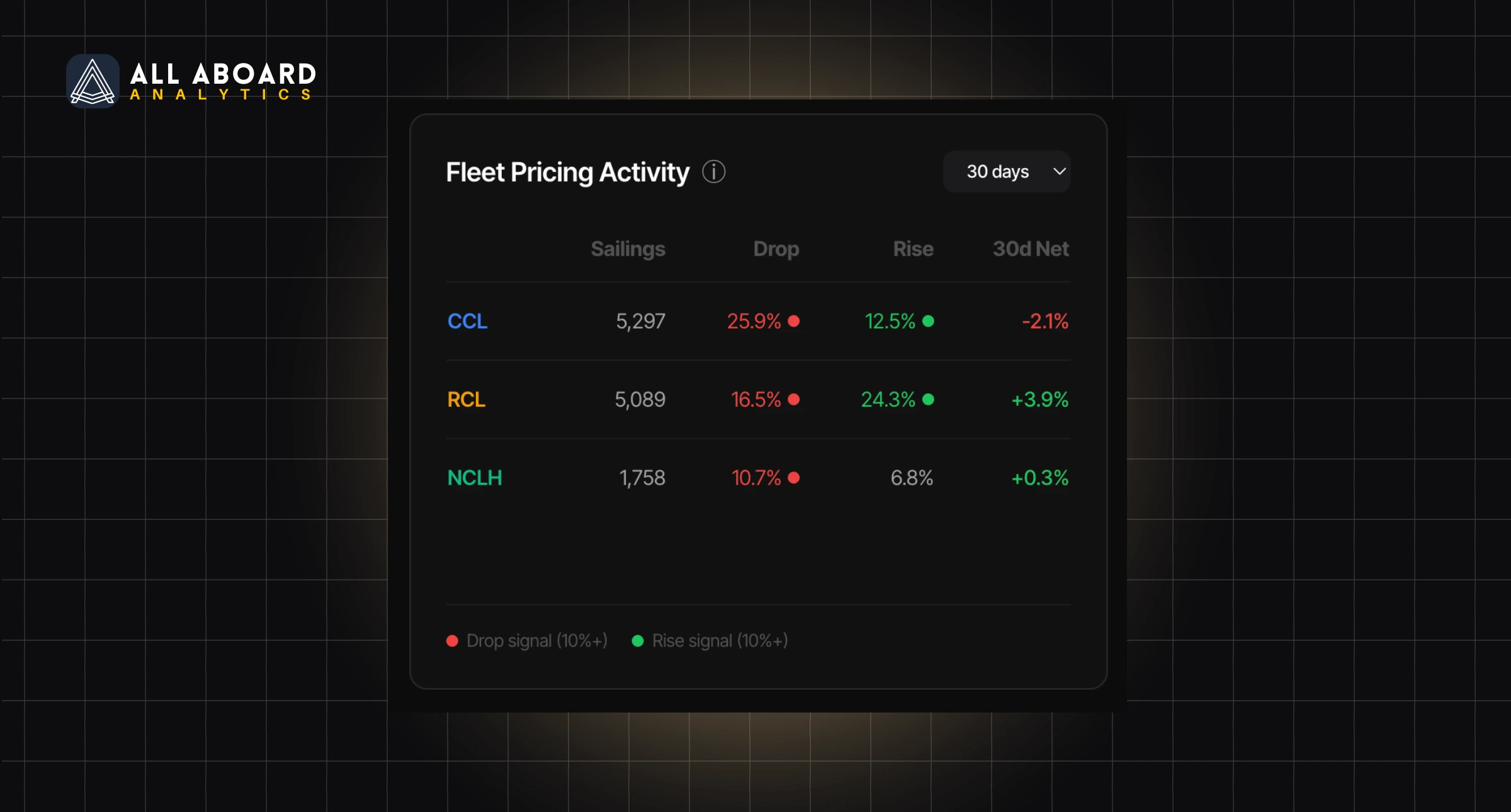 Fleet Pricing Activity panel showing drop and rise signals for CCL, RCL, and NCLH